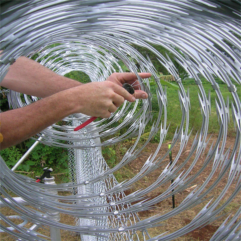 板做材料,由專用機械強力包附與熱鍍鋅高碳鋼絲或不銹鋼絲做的芯線上。由于有著鋒利美觀的刀片刺、高強度的芯線,使本產品綜合了防