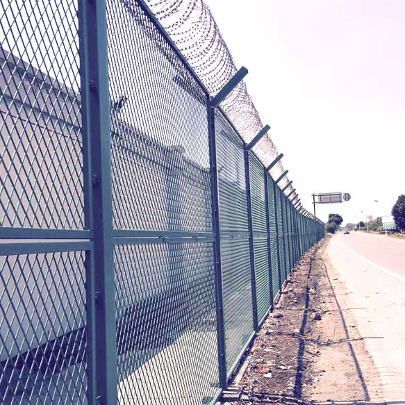 年來(lái),被廣泛應(yīng)用在機(jī)場(chǎng),軍事基地等高安全場(chǎng)所.注:如果在機(jī)場(chǎng)護(hù)欄網(wǎng)頂部加裝刀片刺絲,刀片刺繩后又很好的增強(qiáng)了安全防護(hù)性能.采用