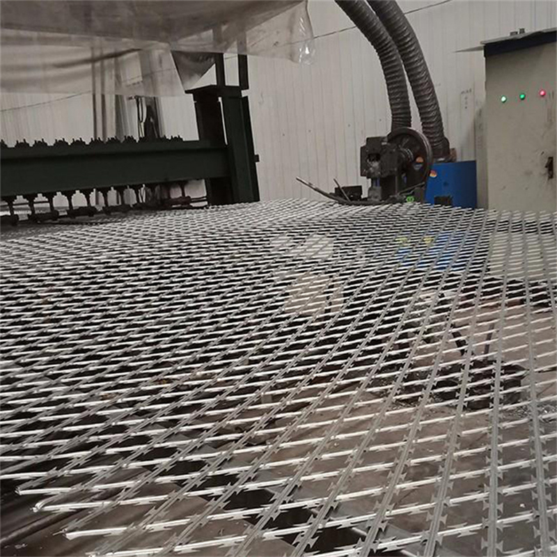 2、焊接刀刺網(wǎng)成型:把沖好的刀片裹在熱鍍鋅絲上面,經(jīng)調(diào)直達到預定的長度自動切斷,送入到模具內(nèi),排焊機把經(jīng)和緯相交叉的部分,沖